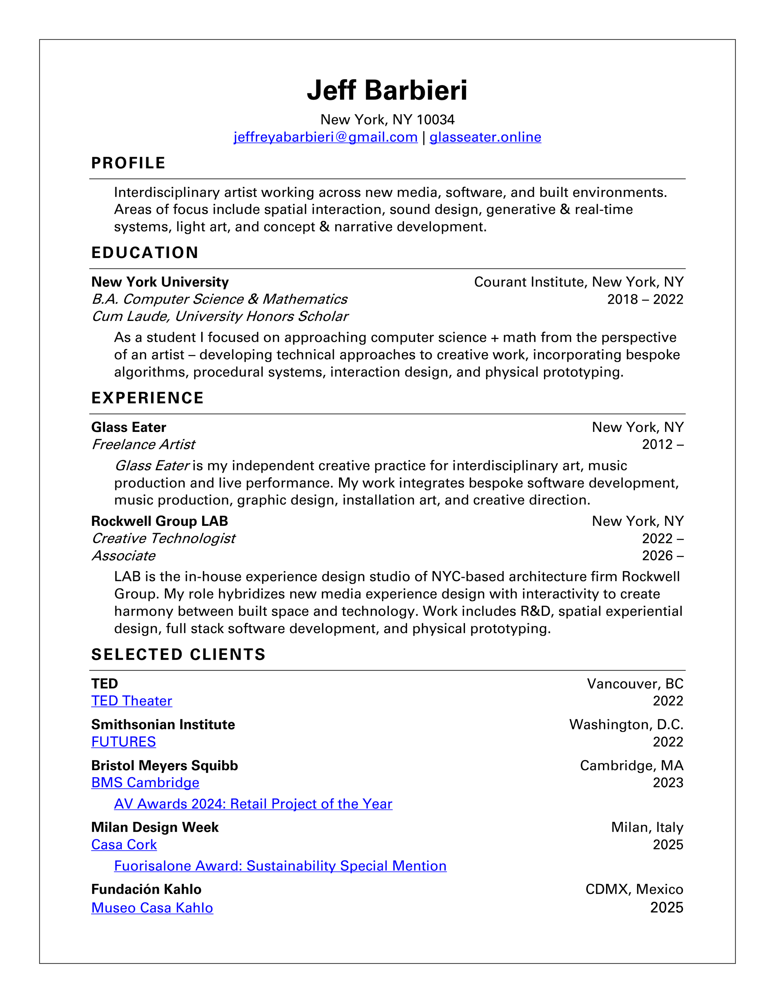 I currently work at Rockwell Group LAB as a Creative Technologist. LAB is architecture firm Rockwell Group’s in-house experience design studio. My role hybridizes new media experiences with interaction design to create harmony between built space and technology. Project work includes spatial experiential design, full stack software development, physical prototyping, and planning internal R&D efforts.